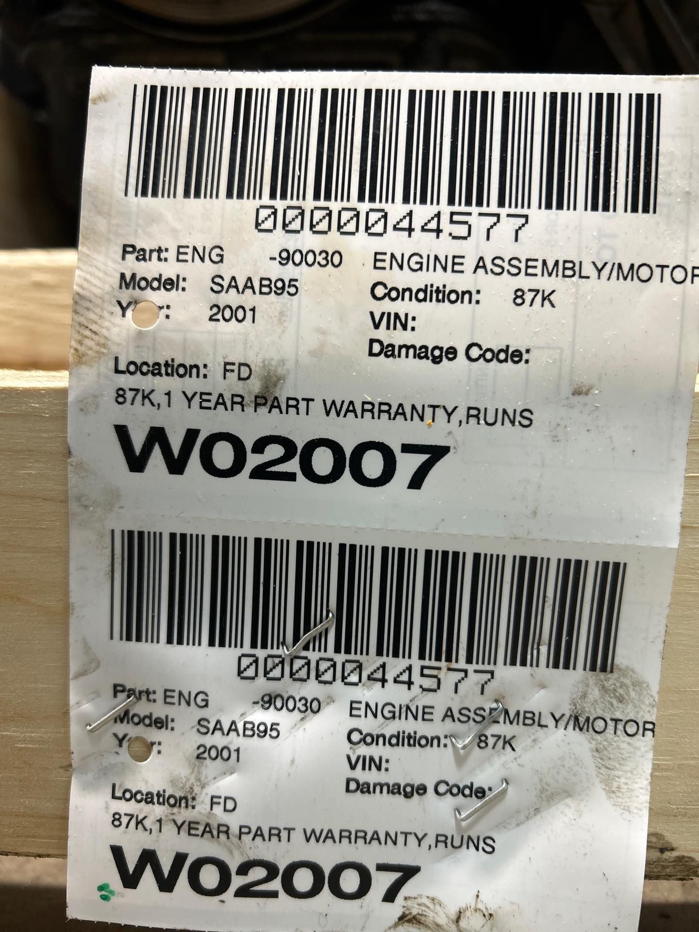 This is a quality Used OEM Engine removed from a 2001 SAAB 9-5 and covered by our standard 6 Month Money Back Part Guarantee. This engine has 87000 miles on it. When new vehicles arrive, our experienced inventory staff will run the car to operating temperature. We check for any smoking, leaking or noises. When dismantled, the car will again be brought up to operating temperature to ensure there is no noise or smoking. Once the engine is pulled from the vehicle it is brought over to our engine and transmission staff that will look it over once more before putting it onto our shelf or packaging it for shipment. Many of the engines we list are still in vehicles, in which case the engine will be run and tested before being shipped.All engines are sold as a long block which includes Oil pan, Block, Heads and Valve Covers. Any other included components are considered convenience items and are not covered by our Guarantee. Almost all engines will include intake manifolds, exhaust manifolds, fuel system, harness and sensors. You should expect to use your existing intake manifold(s), exhaust manifold(s), sensors, and harness to eliminate complications when installing a used engine.