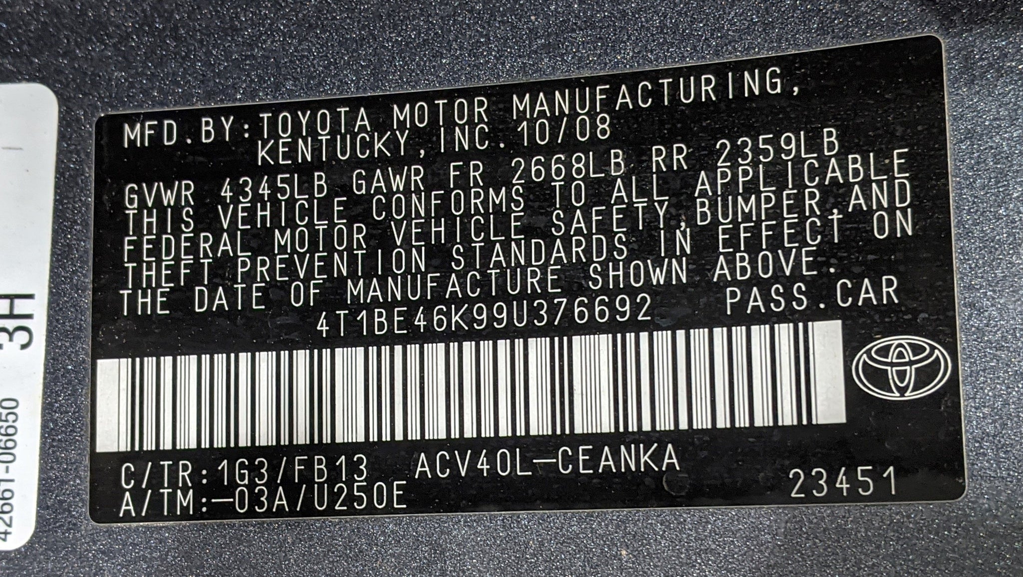 This item is being pulled from the Vehicle Shown below2009 Toyota Camry Stock # R03037 VIN # 4T1BE46K99U376692